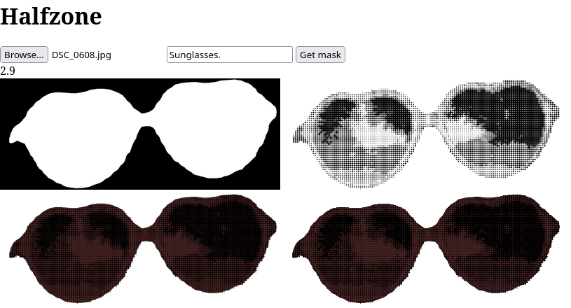 Three was already solved, but one was the main concern (at least initially - it wasn't clear that SAM-2 would be too good at this). Helpfully, the repo authors of lang-segment-anything included an example snippet which predicts a mask from an image and a prompt but says nothing about the output format or further processing. Running the snippet and checking the keys on the prediction result reveals six things of potential interest: 'scores', 'labels', 'boxes', 'masks', 'mask_scores'. 'masks' seems particularly juicy, and the high dimension size suggests this is meant to be used as (or to produce) a visual overlay for the original image (just what we want! we can use this to cut the images out like the original online segment-anything demo). I got a little stuck here and did consult an LLM which helped me figure out that the mask is a map of the input to confidence values related to the prompt thresholded by the model's existing wrapper and kept in a range between zero and one. Using numpy to pull these values out into an array and multiplying the individual values by 255 gives us the full black-white range that we want for our mask. PIL has a fromarray method we can use to automagically create our mask image. Example from this stage here: