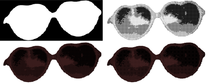 Four: a way to combine the mask, a flat background color, and the generated grayscale halftone without needing to use GIMP or similar